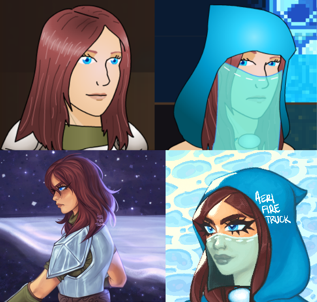 I made a very heartfelt piece of Emela in 2023. It's viewable in both mountain and lake-side upright orientations, featuring her Ch2 and Ch3 outfit and demeanors. My own life drastically changed around the time I made this piece; I got married and left yet another unfortunate situation. (Alt text the same for both photos)