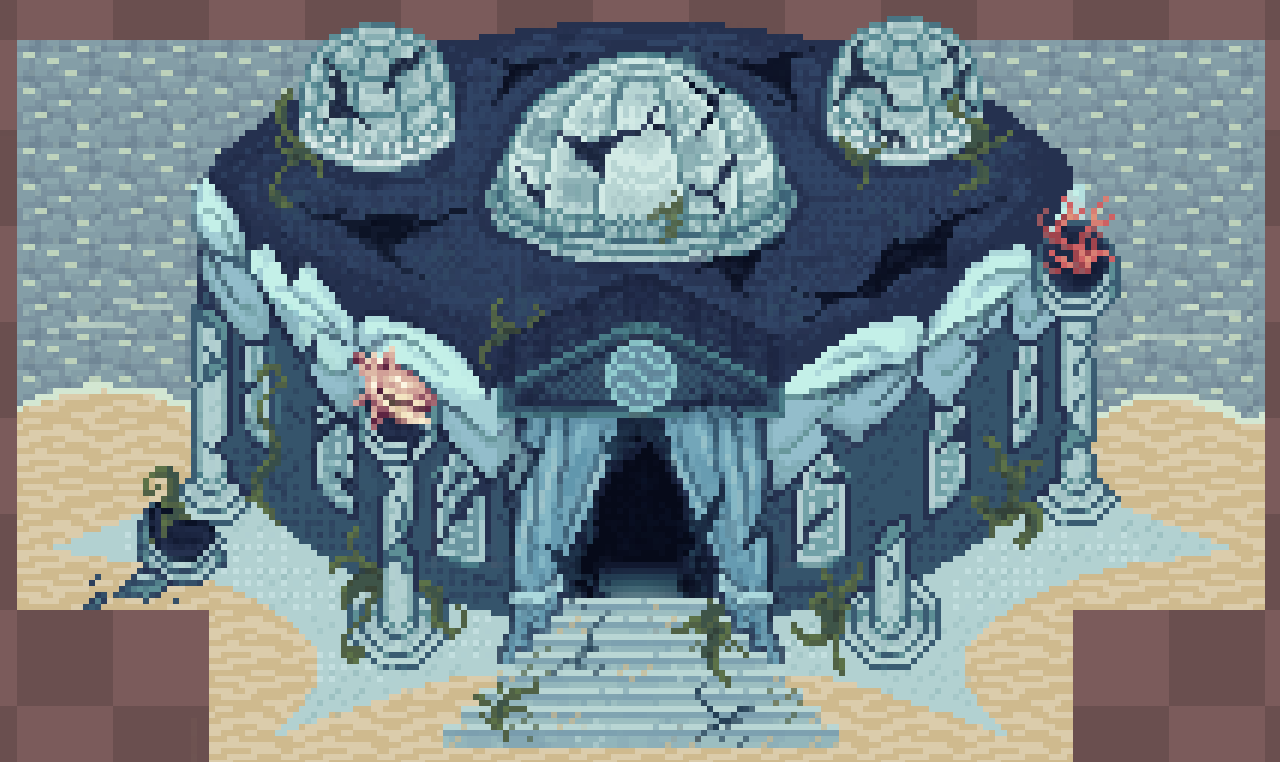A decrepit Temple sits on the seashore. It's a round, blue building with a dark roof and 3 shattered glass domes. The stairs, pillars, and floor are a light pale blue. There's pale blue curtains around the edges, and draping the door. Greenery has started to overgrow. The picture is a WIP and drawn in pixel art style.